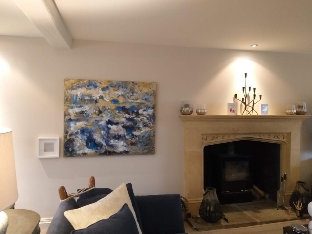 Ten Thousand Skies Meet One Thousand seas is a recent commission I finished for a family who love to travel. I met them when their living room had been completed by their interior designers who brought me in to add the finishing touch to the space. Working with the palette, the passions and concepts we discussed, I created this abstract piece to convey the families deep connection with the sea, the world, and the environment. The couple work with people to make a difference, through coaching and communication. They wanted to feel revitalised and restored when they sat to contemplate it. Acrylic on canvas 150 x 100 cm.